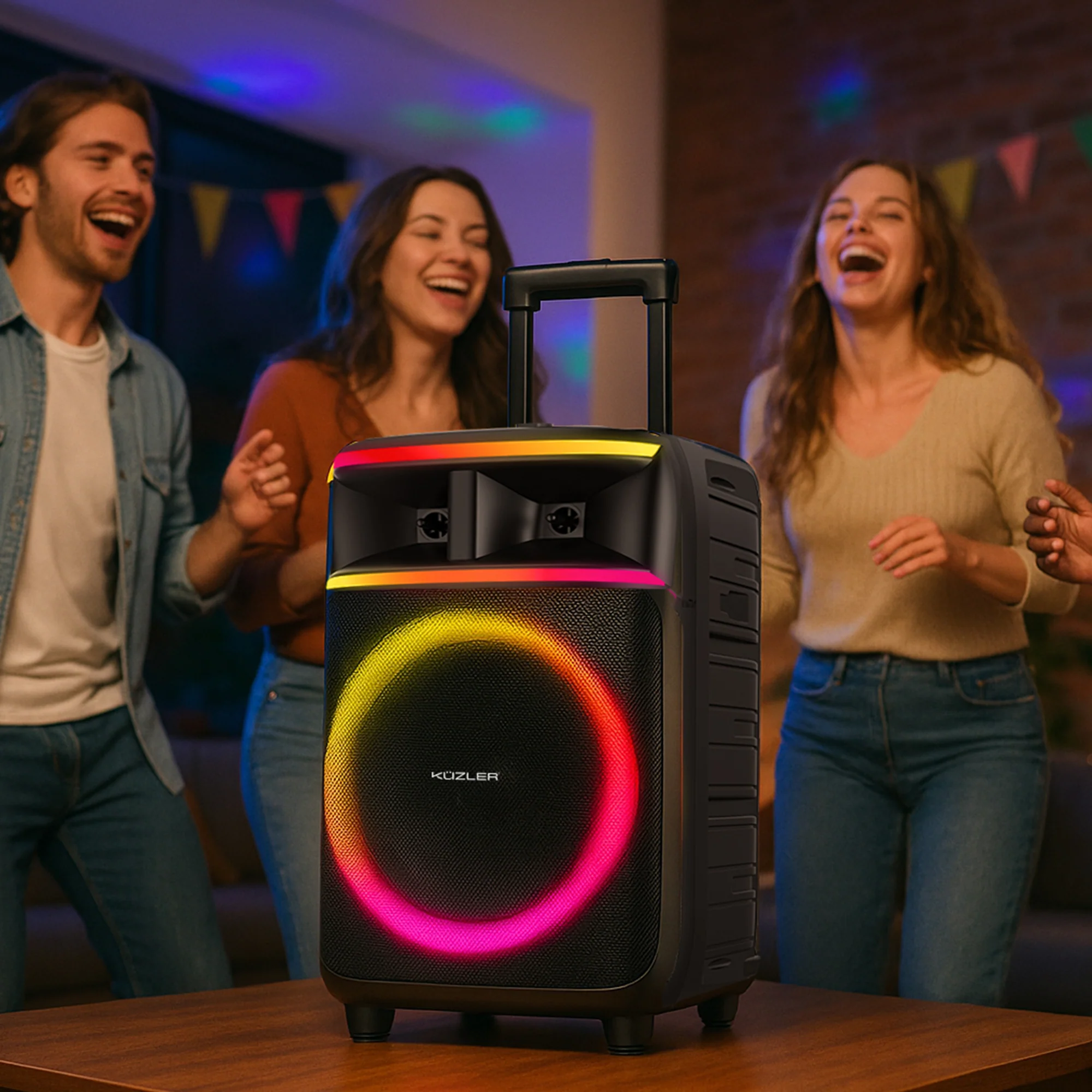 Ambiente Visual Dinámico: Sus luces LED integradas cambian al ritmo de la música, creando una atmósfera festiva inmediata.